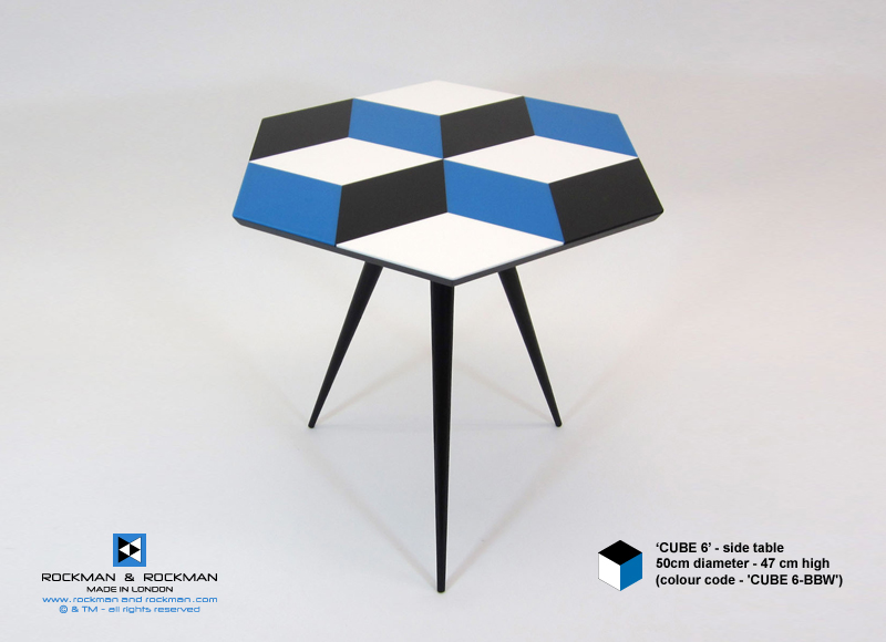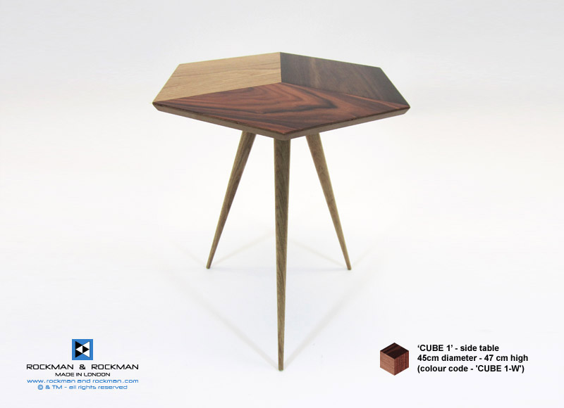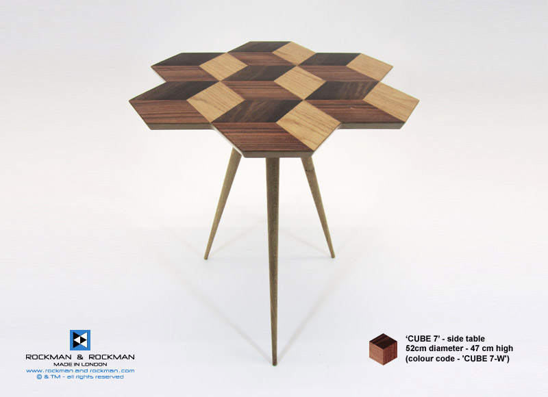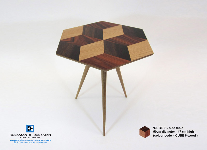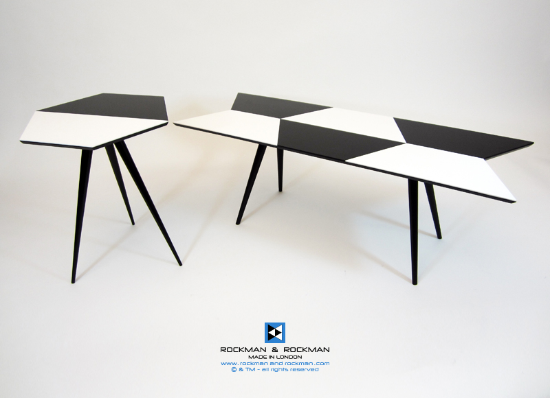 Cast acrylic and Wood Veneer geometric parquetry tables with Oak or black shellac lacquer bases, all handmade in London.